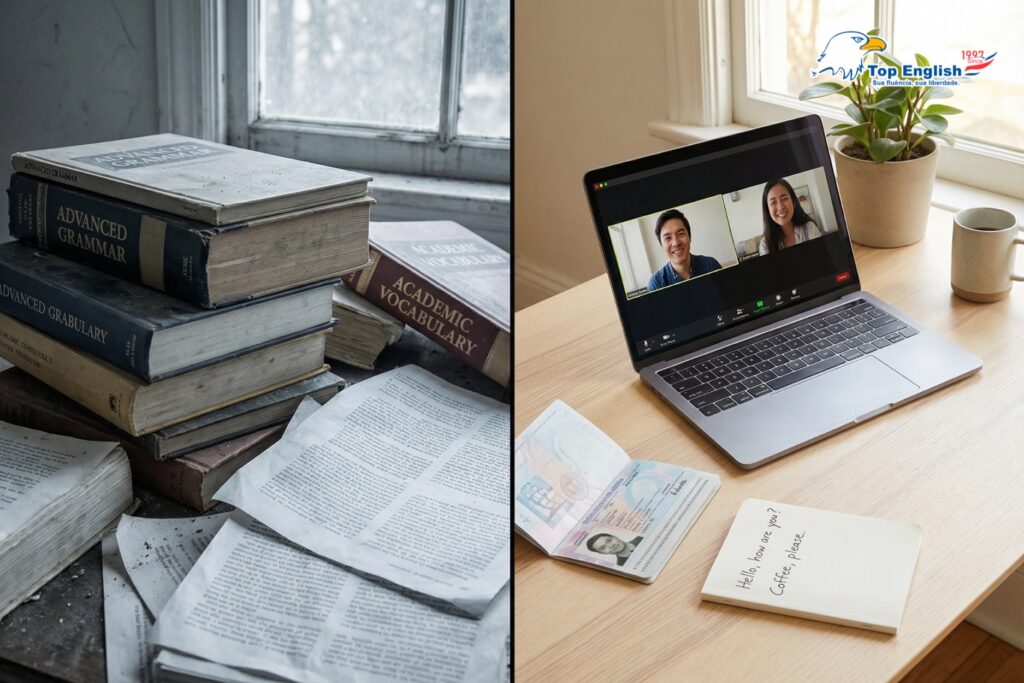 O inglês que você acha que precisa é um idioma estático, acadêmico e purista, repleto de regras gramaticais complexas e exceções raras. É a ideia de que você precisa conhecer o nome de cada ferramenta em uma caixa de ferramentas ou dezenas de phrasal verbs obscuros para poder se comunicar. Essa mentalidade gera ansiedade, medo de errar e, consequentemente, o temido bloqueio na hora de falar.